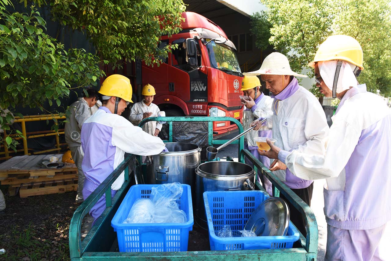 烈日炎炎,酷暑難擋,集團(tuán)公司廣大員工堅(jiān)守崗位,奮戰(zhàn)高溫。今天下午,總務(wù)部開始為高溫一線員工送上涼爽可口的消暑湯。和往年一樣,氣溫在35℃以上的日子,總務(wù)部將在每天下午把解暑湯送到生產(chǎn)現(xiàn)場,冰鎮(zhèn)綠豆、銀耳羹、蝦皮咸菜湯……品種每天有變化,讓員工在酷暑天感受到公司的關(guān)懷。保持旺盛干勁。